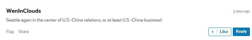 網(wǎng)友Wenln Clouds:西雅圖再次成為了中美關(guān)系的中心,至少是中美商貿(mào)關(guān)系的中心!
