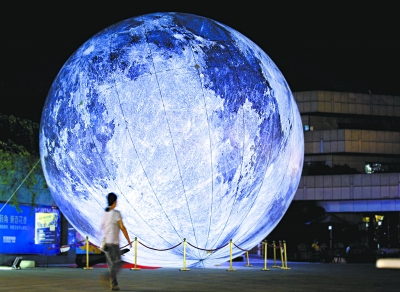 9月25日,市民從南京北極閣廣場布置的超級“月亮”景觀球旁經(jīng)過。