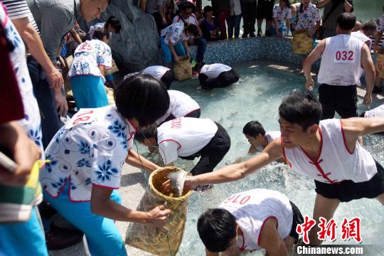 參賽運動員進行稻田抓魚比賽!⑽臉恕z