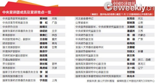 從宣講團(tuán)的成員構(gòu)成看,超過(guò)三分之一的宣講員為國(guó)務(wù)院部委的“一二把手”,來(lái)自的部委包括國(guó)家發(fā)改委、教育部、科技部、財(cái)政部、國(guó)土資源部、環(huán)保部、住建部、交通運(yùn)輸部、農(nóng)業(yè)部、商務(wù)部、衛(wèi)計(jì)委、國(guó)資委等;還有來(lái)自中宣部、中央政研室、中央財(cái)辦、全國(guó)人大、全國(guó)政協(xié)的相關(guān)負(fù)責(zé)人以及最高智囊機(jī)構(gòu)中國(guó)社科院、國(guó)務(wù)院發(fā)展研究中心的學(xué)者。