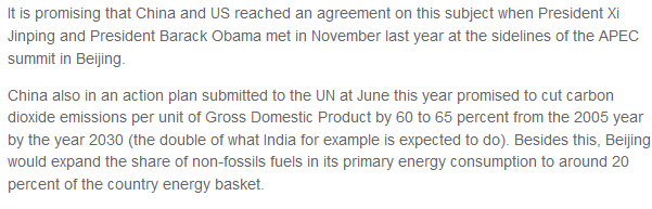 11 月底來(lái)自 190 多個(gè)國(guó)家各界人士聚首巴黎,希望通過(guò)磋商達(dá)成一項(xiàng)解決全球氣候變化問(wèn)題的協(xié)議。其中減少碳排放量和化石燃料的使用最受各方關(guān)注。而中美兩國(guó)于 2014 年 11 月在北京召開(kāi)的 APEC 會(huì)議上達(dá)成的共識(shí)為這一目標(biāo)的實(shí)現(xiàn)打下了良好的基礎(chǔ)。