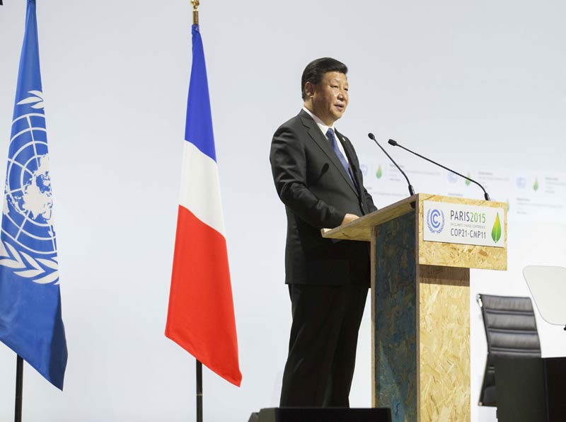 圖為:2015年11月30日,國家主席習近平在巴黎出席氣候變化巴黎大會開幕式并發(fā)表題為《攜手構(gòu)建合作共贏、公平合理的氣候變化治理機制》的重要講話。