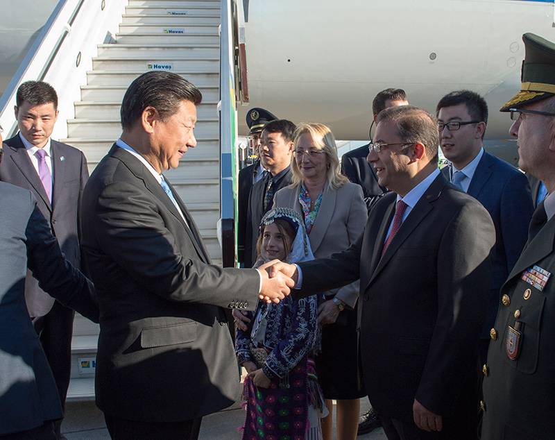 圖為:2015年11月14日,國家主席習近平抵達土耳其安塔利亞,應土耳其共和國總統(tǒng)埃爾多安邀請,出席二十國集團領(lǐng)導人第十次峰會。土耳其高級官員到機場迎接習近平主席一行。