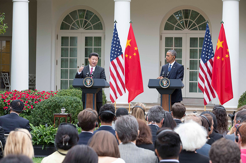 圖為:2015年9月25日,國家主席習近平在華盛頓同美國總統(tǒng)奧巴馬舉行會談。會談后,兩國元首共同會見記者。