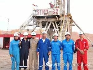 這是2015年8月14日,中石化中原油田員工與沙特阿美石油公司員工在沙特東部一油田鉆井平臺前合影。(新華社記者王波攝)