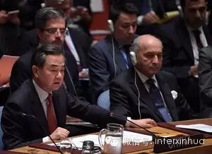 2015年9月30日,在紐約聯(lián)合國總部,中國外交部長王毅(前左)在“解決中東及北非地區(qū)沖突和應(yīng)對地區(qū)恐怖主義威脅”安理會部長級會議上講話。(新華社記者殷博古攝)