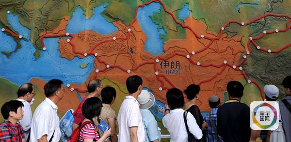 2010年9月2日,游客在上海世博會伊朗館內(nèi)觀看反映古代絲綢之路走向的地圖(新華社記者藺以光攝)