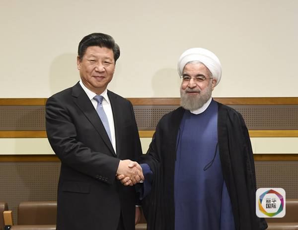 2015年9月28日,習近平主席在紐約聯(lián)合國會見伊朗總統(tǒng)魯哈尼。(新華社記者李學仁攝)