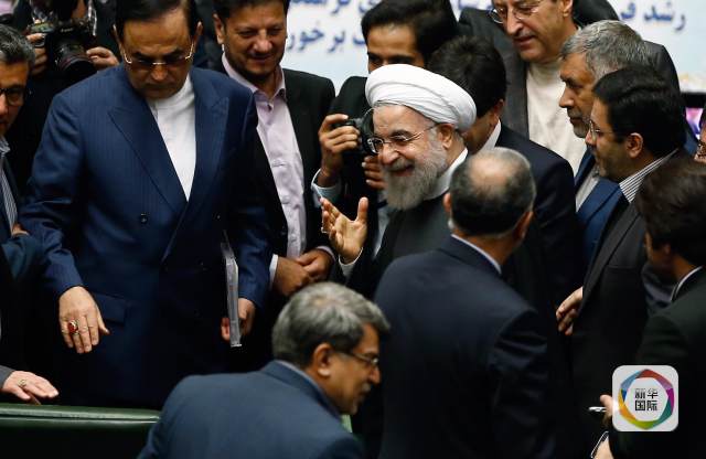 2016年年1月16日,伊核問題全面協(xié)議正式執(zhí)行。根據(jù)協(xié)議,伊朗將限制其核計劃,作為交換,國際社會將解除對伊朗制裁。圖為1月17日,在德黑蘭,伊朗議會成員向魯哈尼總統(tǒng)(中右)表示祝賀。(新華社/歐新中文)