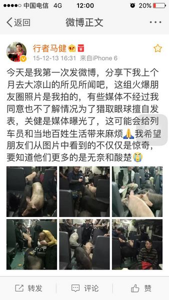 2015年12月13日,馬健剛學(xué)習(xí)使用微博,發(fā)布的第一條就是“豬人同車”的組圖,用他自己的話來說,是為了“以正視聽”。微博中這樣寫道:“有些媒體不經(jīng)過我同意也不了解情況、為了獵取眼球擅自發(fā)表,關(guān)鍵是媒體曝光了,這可能會給列車員和當(dāng)?shù)匕傩丈顜砺闊!?/p>