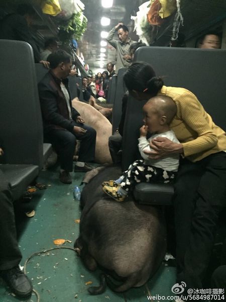 “豬人同車承載著我國偏遠貧困地區(qū)太多無奈,看稀奇的同時,也讓我們感謝那些同乘人們的寬容與理解!陛^早轉(zhuǎn)發(fā)組圖的@江蘇陳德陽,微博中這樣寫道。
