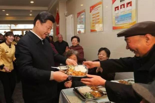 2013年2月4日,習(xí)近平來到蘭州一家“虛擬養(yǎng)老院”的養(yǎng)老餐廳,了解有關(guān)情況,還端起一個盛滿飯菜的餐盤,走到72歲的老人楊林太面前,輕輕送上,請他用餐。