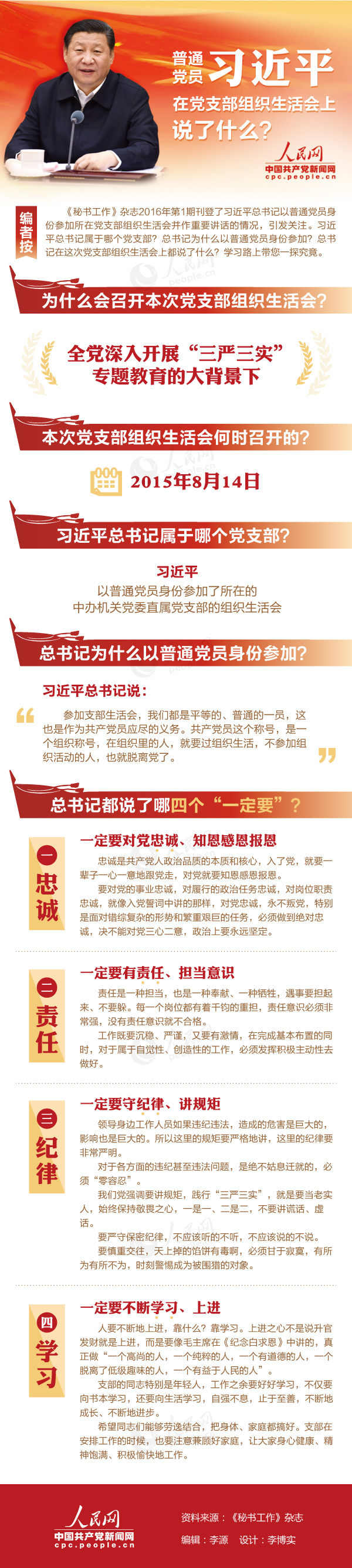 在全黨深入開(kāi)展“三嚴(yán)三實(shí)”專(zhuān)題教育之際,2015年8月14日,中共中央總書(shū)記、國(guó)家主席、中央軍委主席習(xí)近平以普通黨員身份參加了所在的中辦機(jī)關(guān)黨委直屬黨支部的組織生活會(huì),與支部成員一起交流并發(fā)表了重要講話。