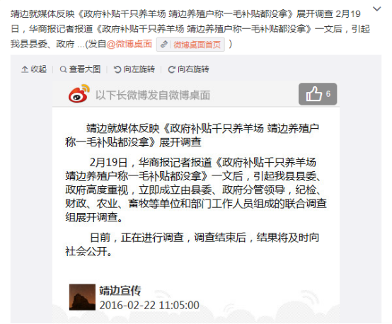 記者最終在外宣辦了解到,該縣確已成立調(diào)查組著手調(diào)查此事,調(diào)查組成員由紀(jì)檢委、財政局、農(nóng)業(yè)局、畜牧局等部門組成。應(yīng)記者要求,外宣辦工作人員承諾向記者提供成立調(diào)查組的詳細(xì)文件。在記者向該工作人員提供了手機(jī)號碼和電子郵箱后,并未收到成立調(diào)查組的文件,隨后該工作人員致電記者稱,已在“靖邊宣傳”官方微博發(fā)布此事進(jìn)展,建議記者查看微博。記者在微博上看到,事情確如其所述。