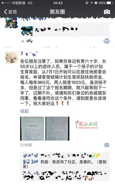 “如果你身邊有男六十歲、女55歲以上的退休人員,屬于一個孩子的計劃生育家庭,從7月1日開始可以在居住地居委會報名,申請享受城鎮(zhèn)計劃生育獎勵扶助資金,每人每年960元,兩人就是1920元,雖說錢不多,但是過了這個報名期限,就只能等到下一年了!2月26日,一則關(guān)于獨生子女父母獎勵標(biāo)準(zhǔn)、發(fā)放時間和形式在朋友圈內(nèi)流傳,更有網(wǎng)友在轉(zhuǎn)發(fā)的同時表示咨詢過當(dāng)?shù)鼐游瘯,讓謠言一時幾乎成真。