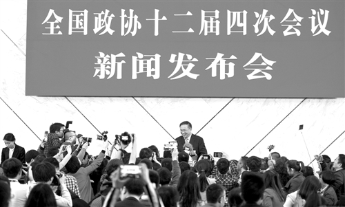 全國政協(xié)十二屆四次會議2日下午在人民大會堂舉行新聞發(fā)布會。大會新聞發(fā)言人王國慶向中外媒體介紹本次大會的主要安排和有關(guān)情況,并回答記者提問。