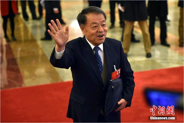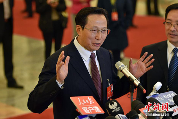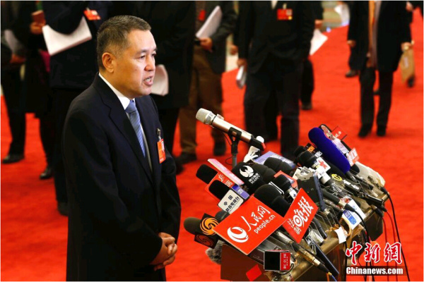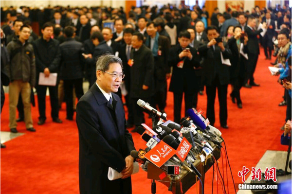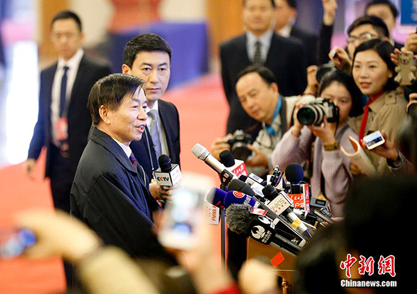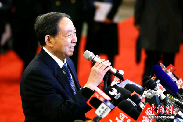農(nóng)業(yè)部部長(zhǎng)韓長(zhǎng)賦通過(guò)“部長(zhǎng)通道”時(shí)接受采訪。中新社記者 金碩 攝