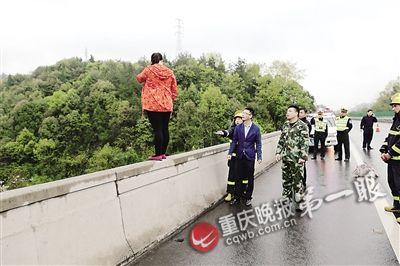 重慶晚報訊 昨日10:45,渝湘高速酉陽往秀山途中的田壩大橋,一名紅衣女子(如圖)站在高速公路大橋護欄上,3小時徘徊在輕生沖動中。救援人員不斷開導都沒有成功,沒想到,人群中一句“娃兒都快放學了”,才讓紅衣女徹底放棄輕生念頭。