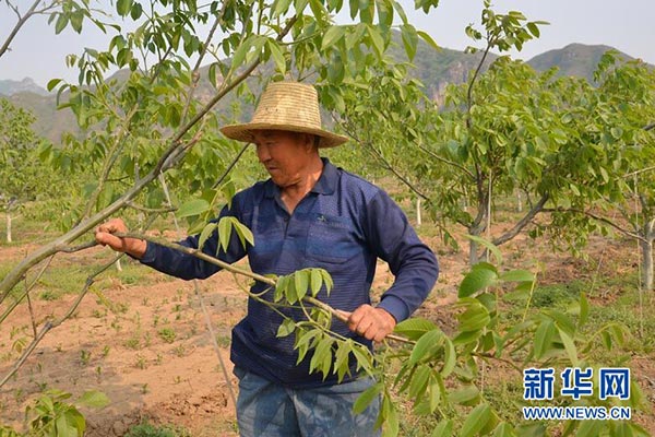 易縣田崗村村民于紀(jì)元在為合作社的核桃樹拉枝 新華網(wǎng) 魏會(huì)博 攝