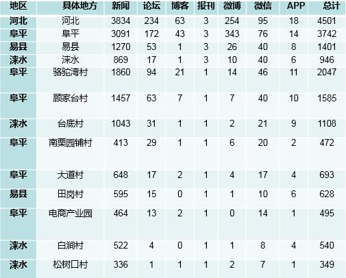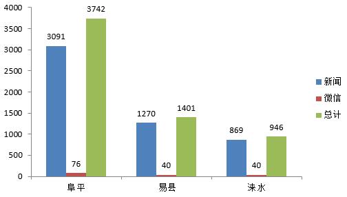 從縣市來看,阜平由于村莊多、話題多,成為報(bào)道量最多的縣,共有網(wǎng)絡(luò)新聞文章(包括央媒原創(chuàng)和地方網(wǎng)站轉(zhuǎn)發(fā))3091篇,微信文章76篇,加上報(bào)刊、論壇、博客、微博、APP等平臺(tái),總報(bào)道量為3742篇,遠(yuǎn)超過易縣和淶水。