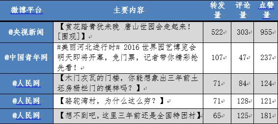 從微博端來看,截止到5月9日,@人民網(wǎng)主持的微博話題#河北扶農(nóng)助農(nóng)新路子#有538.5萬的閱讀量和374條討論,主要側(cè)重于扶貧報(bào)道,@央視新聞主持的話題#美麗河北進(jìn)行時(shí)#有569.9萬的閱讀量和816次討論,主要側(cè)重于世園會(huì)的開幕。轉(zhuǎn)發(fā)量最高的微博來自于@央視新聞,達(dá)522條,而扶貧方面轉(zhuǎn)發(fā)評與論量最高的微博則關(guān)于駱駝灣村。