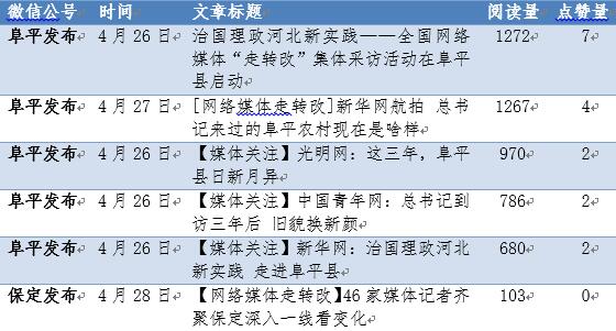 從微信來看,地方發(fā)布和新聞網(wǎng)站公眾號(hào)成為了發(fā)布相關(guān)話題的主力,阜平發(fā)布與保定發(fā)布都開設(shè)了系列報(bào)道。從傳播力來看,作為縣級(jí)官微的阜平發(fā)布,其傳播力較市一級(jí)的保定發(fā)布更廣。