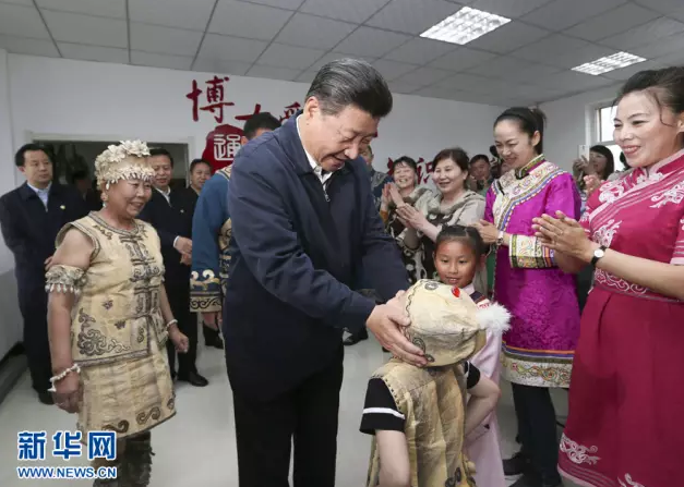 5月24日下午,習(xí)近平在佳木斯市同江市八岔赫哲族鄉(xiāng)八岔村同正在進(jìn)行伊瑪堪說唱教學(xué)的村民們親切交流。 新華社記者 蘭紅光 攝