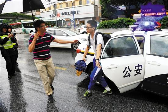 今天上午暴雨突襲,華南師范大學(xué)附屬中學(xué)考點(diǎn),交警開(kāi)車(chē)為遲來(lái)的考生送考 羊城晚報(bào)記者 湯銘明 攝