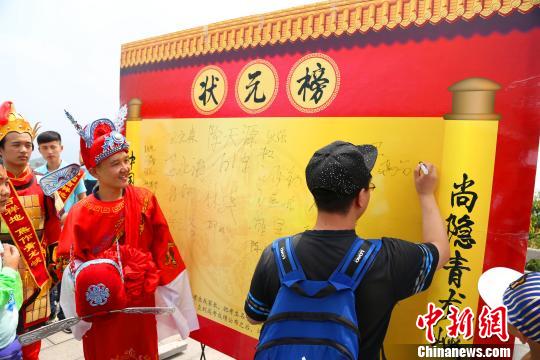 6月9日,在河南焦作青龍峽景區(qū),一面為參加高考后的考生設立的“狀元墻”引眾多游客圍觀。大量在此游玩的學子在“狀元墻”上題寫高考心愿,祈愿考入夢想中的大學。當日是端午節(jié),在現(xiàn)場還有一位年輕男子裝扮成“狀元郎”為學生與家長游客送吉祥粽子,祝?忌鸢裉崦。