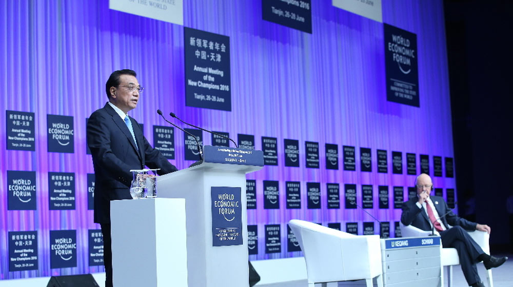 6月27日,世界經(jīng)濟(jì)論壇2016年新領(lǐng)軍者年會(第十屆“夏季達(dá)沃斯論壇”)在天津舉行,中國國務(wù)院總理李克強(qiáng)出席開幕式并發(fā)表特別致辭。