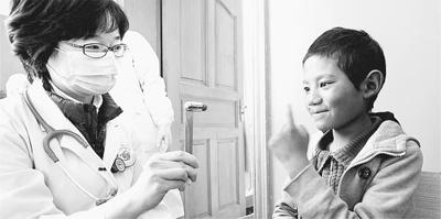 參與“2016年光彩·西藏和四省藏區(qū)母嬰健康行動”的北京大學(xué)第三醫(yī)院兒科副主任醫(yī)師湯亞南(左),在索縣人民醫(yī)院為藏童義診。潘松剛攝