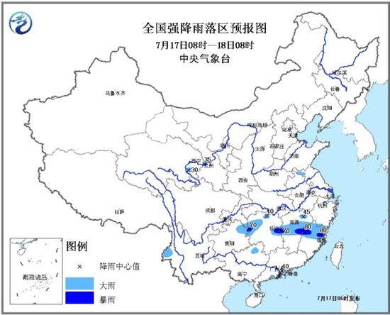 中央氣象臺(tái)7月17日06時(shí)繼續(xù)發(fā)布暴雨藍(lán)色預(yù)警: