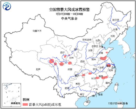 預(yù)計(jì)7月17日08時(shí)至18日08時(shí),山東南部、安徽北部、江蘇北部和西南部、青海東部、四川北部、重慶東南部、湖南北部、江西中部、福建西北部等地的部分地區(qū)將有8-10級(jí)雷暴大風(fēng)或冰雹;安徽北部、江蘇西北部、四川中南部、湖北東部、貴州東北部、湖南北部、江西中部、福建中北部等地的部分地區(qū)將有短時(shí)強(qiáng)降水,小時(shí)雨強(qiáng)為20-40毫米;其中,湖南北部、江西中部局地小時(shí)雨強(qiáng)可達(dá)50-60毫米。