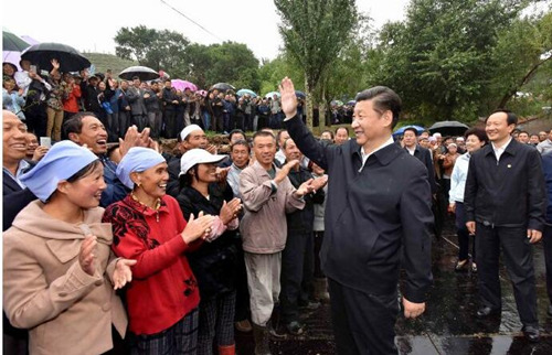 7月18日,習近平總書記到寧夏回族自治區(qū)考察。這是他來到涇源縣大灣鄉(xiāng)楊嶺村看望父老鄉(xiāng)親,實地考察精準扶貧情況。(圖片來源:新華網)