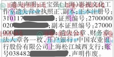 王寶強(qiáng)公司營(yíng)業(yè)執(zhí)照遺失聲明