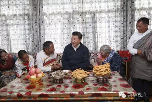 習(xí)近平走進(jìn)長(zhǎng)江源村87號(hào),村民申格的家。藏式客廳寬敞明亮,茶幾上擺放著手抓肉、馓子、糕點(diǎn)和水果。習(xí)近平同申格一家坐在一起拉家常。