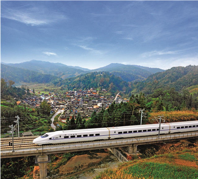 在當時,黎平紅軍橋解決了村民出行的大問題。80多年后,今天黎平的交通狀況畫風(fēng)是這樣的。圖為貴廣高鐵穿過侗寨(貴州省交通運輸廳供圖)。
