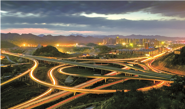 80年后,這座遵義縣龍坑立交橋由8座大橋組成,全長近12公里,為貴州最大的3層互通式立交,是連通杭瑞、蘭海高速的“大動脈”。圖為龍坑立交橋夜景(唐正攝)。