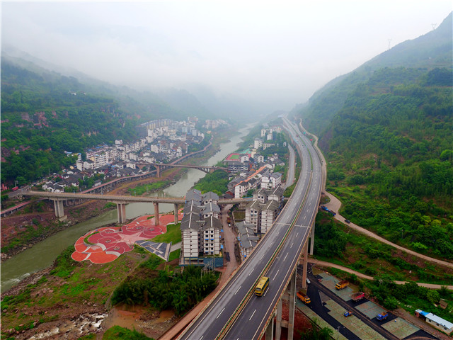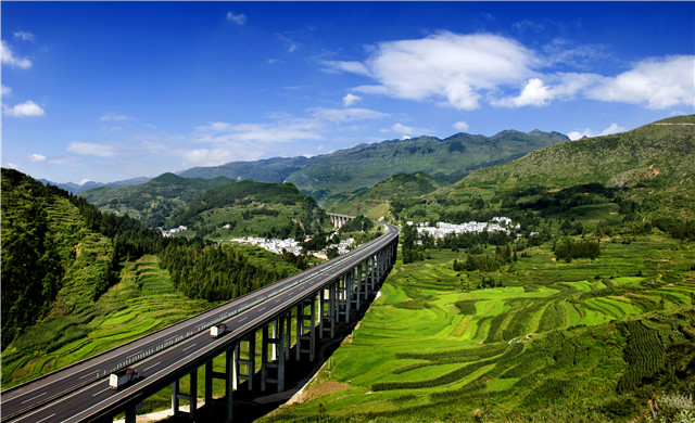 在貴州戰(zhàn)斗的歲月里,紅軍曾經(jīng)轉(zhuǎn)戰(zhàn)黎平、遵義、安順、畢節(jié)、盤縣等68個縣市區(qū),今天,更多更令人驚嘆的大橋出現(xiàn)在這片熱土。圖為在紅軍長征四渡赤水的第一渡元厚鎮(zhèn),高速公路、赤水河航道和旅游公路交相輝映(貴州省交通運輸廳供圖)。