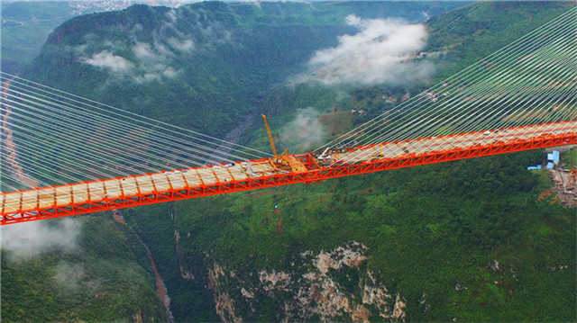 就在幾天前,由貴州、云南兩省合作共建的世界最高橋——杭瑞高速貴州省畢節(jié)至都格(黔滇界)高速公路北盤江大橋?qū)崿F(xiàn)合龍。它的橋面至江面高差達565米,相當于200層樓高。圖為北盤江大橋合龍(圖片來源中交二航局官網(wǎng))。