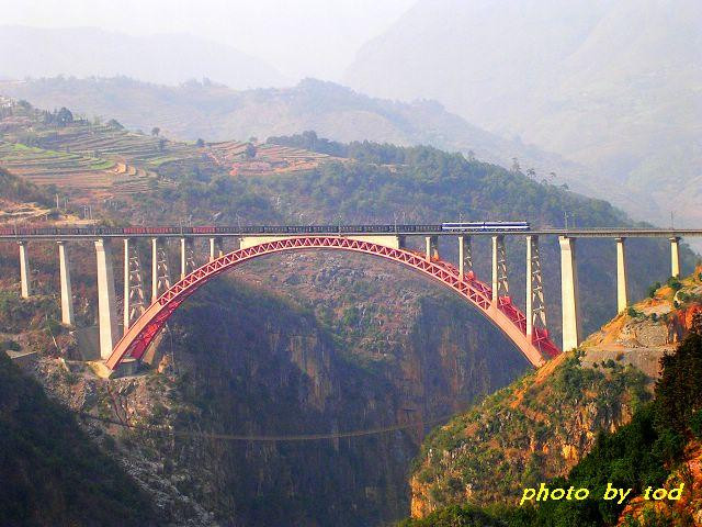 同樣在北盤江上,還矗立著366米高的北盤江公路橋和275米高的北盤江鐵路橋,以及滬昆高速公路上的330米高懸索橋,一條北盤江,四座特大橋,畫風(fēng)很震撼。圖為北盤江鐵路橋(圖片來源網(wǎng)絡(luò))。