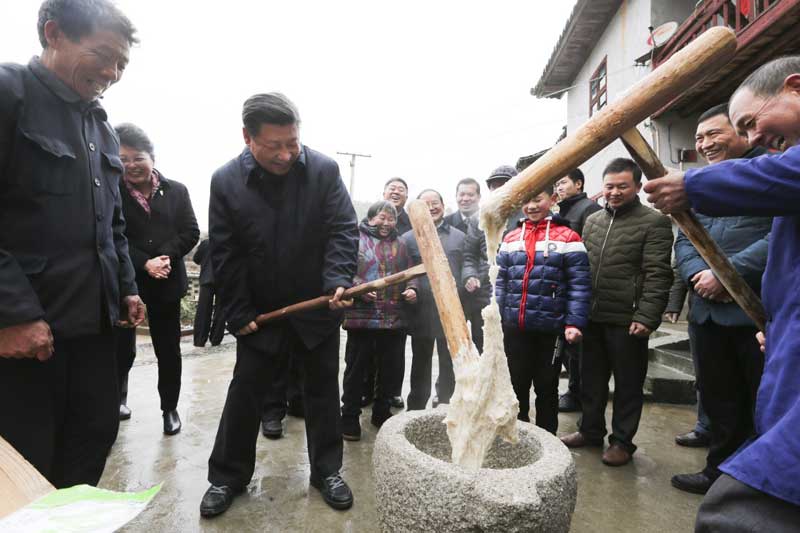 2016年2月1日至3日,中共中央總書記、國(guó)家主席、中央軍委主席習(xí)近平來到江西,看望慰問廣大干部群眾和駐贛部隊(duì)。這是2月2日,習(xí)近平在井岡山市茅坪鄉(xiāng)神山村同村民一起打糍粑。新華社記者 蘭紅光 攝