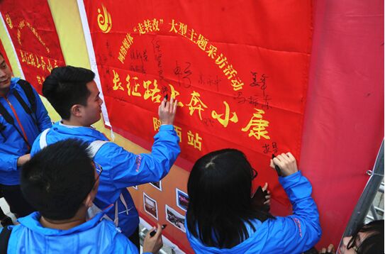 陜西站采訪團(tuán)記者在旗上簽名 中國(guó)青年報(bào)·中青在線記者 劉攀 攝