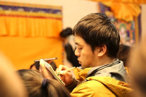 在川主寺鎮(zhèn)傳子溝村唐卡畫院,中國(guó)網(wǎng)記者曹建一邊錄音,一邊記筆記。中國(guó)網(wǎng)信網(wǎng)郭子涵 攝