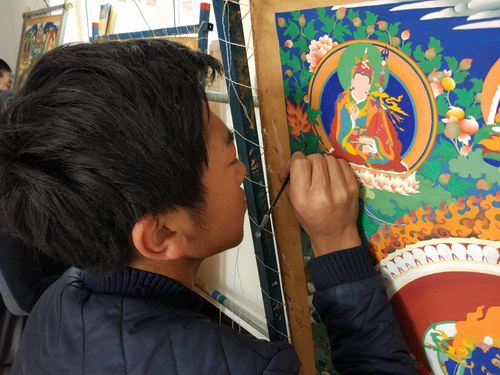 。陜H15歲的周智多杰在班瑪縣唐卡手工藝制作銷售廠里專心學(xué)習(xí)唐卡技藝)