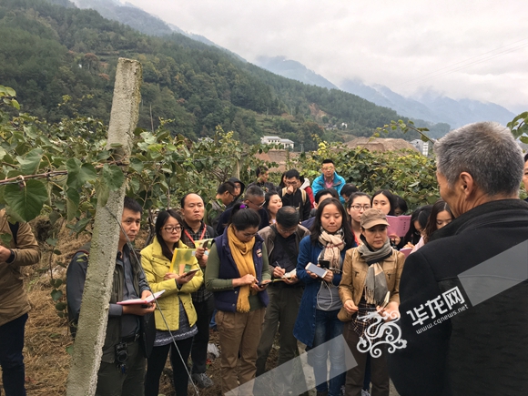 光明村黨支部書(shū)記龐仁斌向采訪團(tuán)介紹獼猴桃種植基地情況。 記者 黃宇 攝