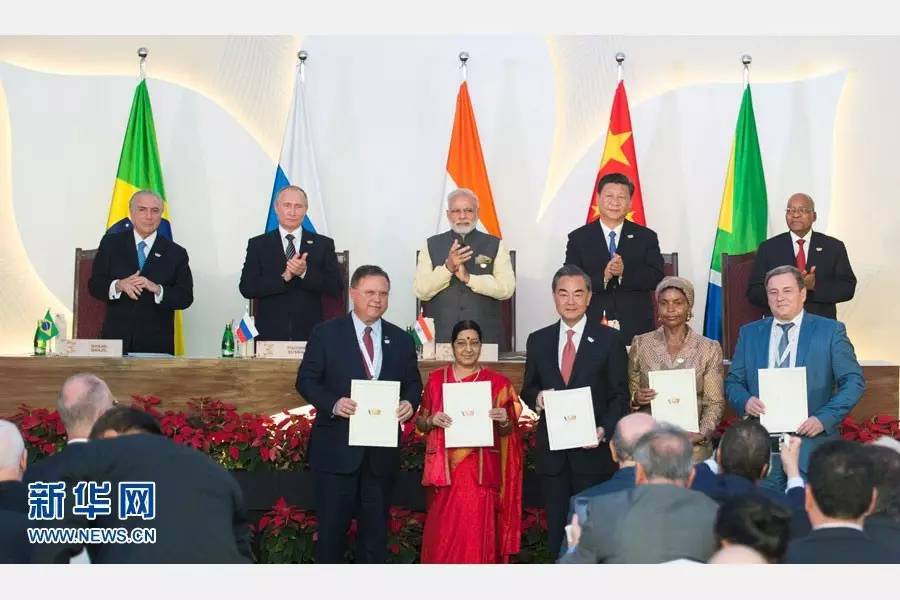 會晤結(jié)束后,5國領(lǐng)導(dǎo)人共同見證《關(guān)于建立金磚國家農(nóng)業(yè)研究平臺的諒解備忘錄》、《金磚國家海關(guān)合作委員會章程》、《金磚國家外交學(xué)院合作諒解備忘錄》等合作文件的簽署,并出席聯(lián)合記者會。