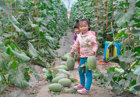瓜棚里,孩子們興奮地幫忙收獲哈密瓜