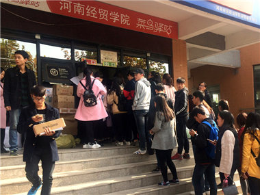 2016年11月10日上午,鄭州龍子湖高校園區(qū)的河南經(jīng)貿(mào)職業(yè)學院內(nèi),網(wǎng)購的大學生們來到校園里的快遞取貨點,排隊領(lǐng)取自己的網(wǎng)購商品。光棍...