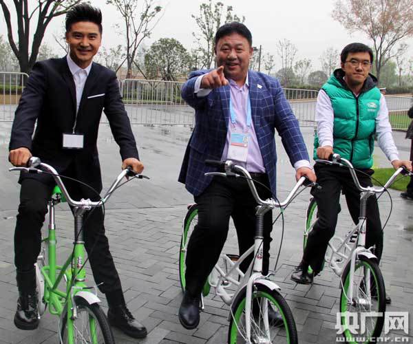 第一視頻集團董事局主席張力軍、快兔出行CEO馬越雷與田亮試騎快兔出行單車